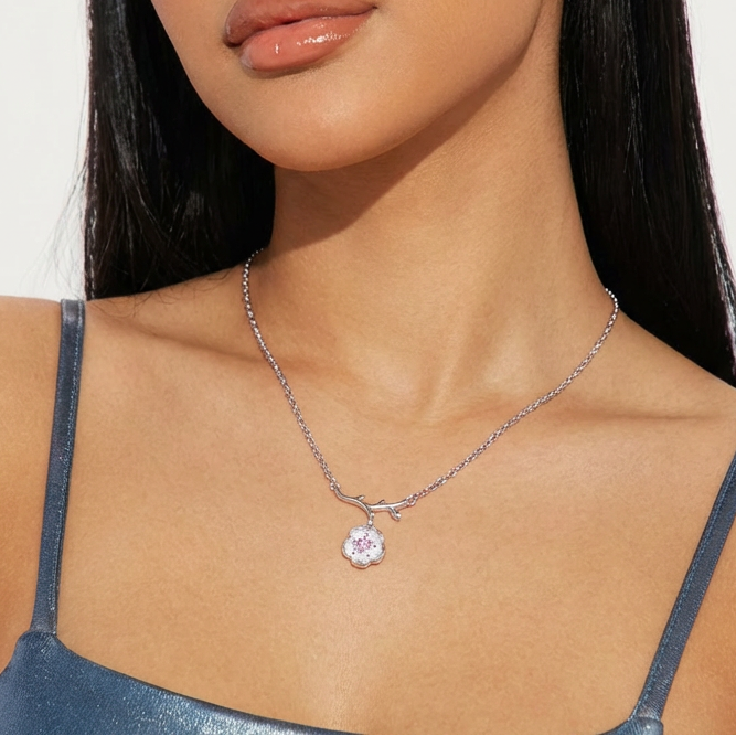 This cherry blossom necklace captures the fleeting beauty of sakura season. Crafted from zinc alloy with electroplated silver finish, the intricate floral pendant features detailed petals that celebrate nature's most romantic bloom. A timeless piece that brings a touch of Japanese-inspired elegance to your everyday style.
